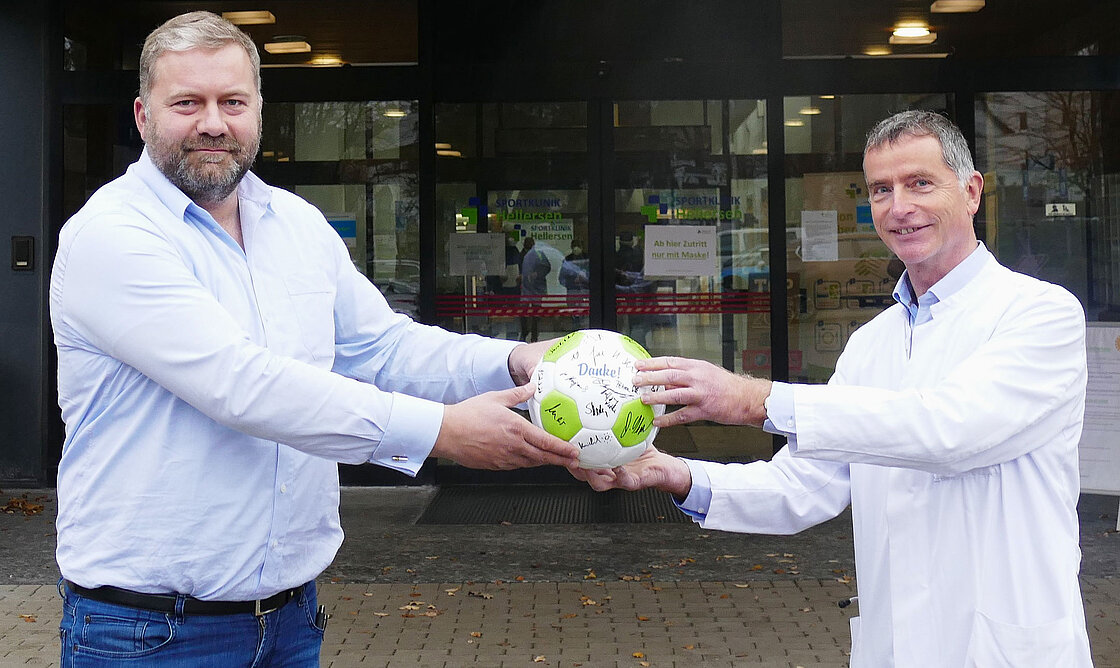 Neben einer kleinen Aufmerksam als Dankeschön für seine geleistete Arbeit überreichte Vorstand Dirk Burghaus Dr. Hagenah auch einen Sportklinik-Fußball, auf dem zuvor alle Führungskräfte unterschrieben hatten.